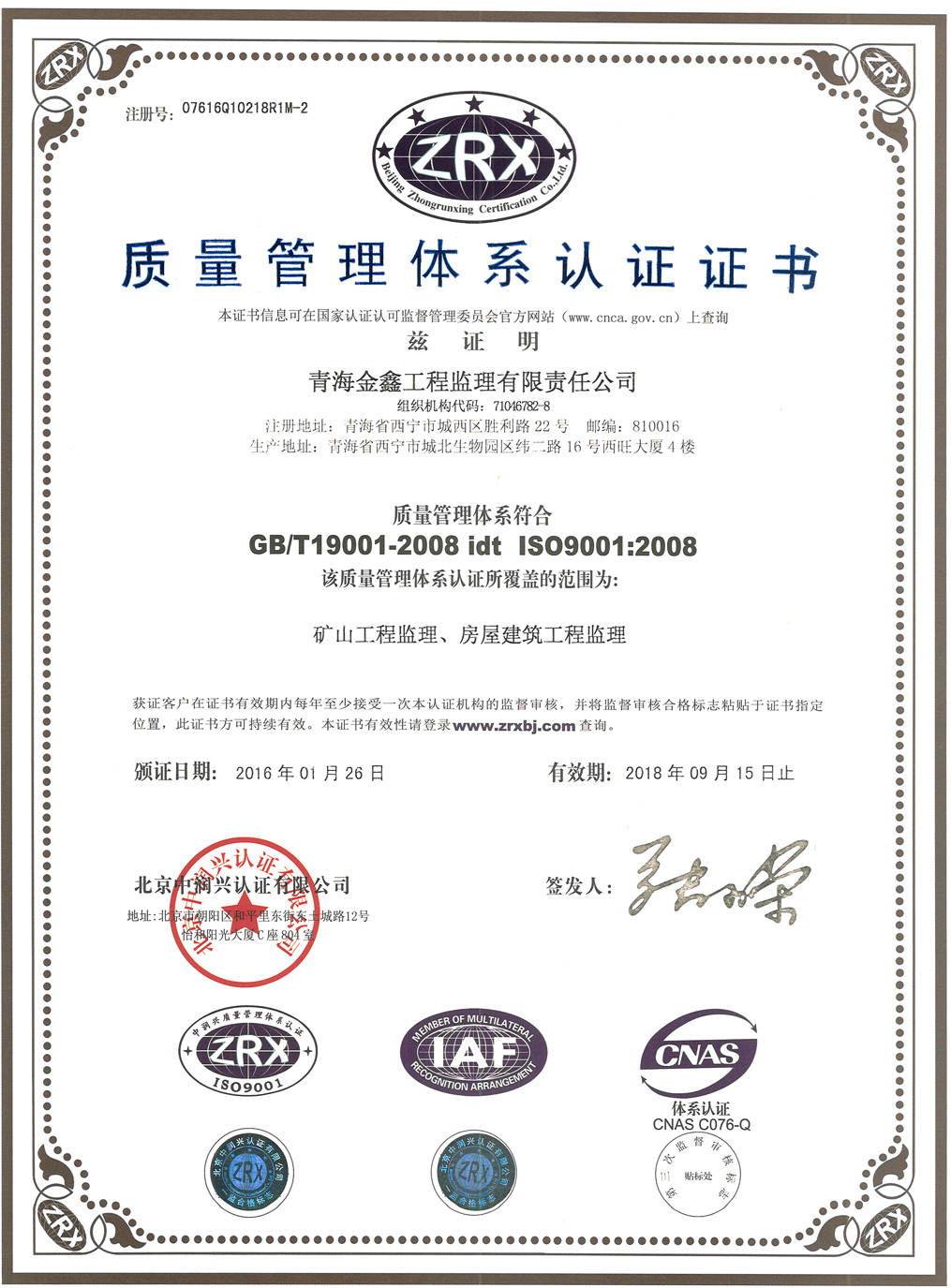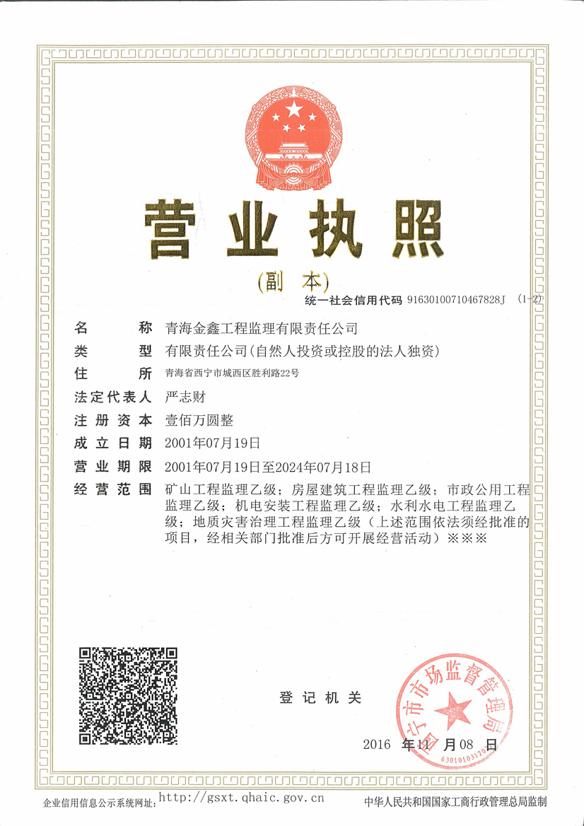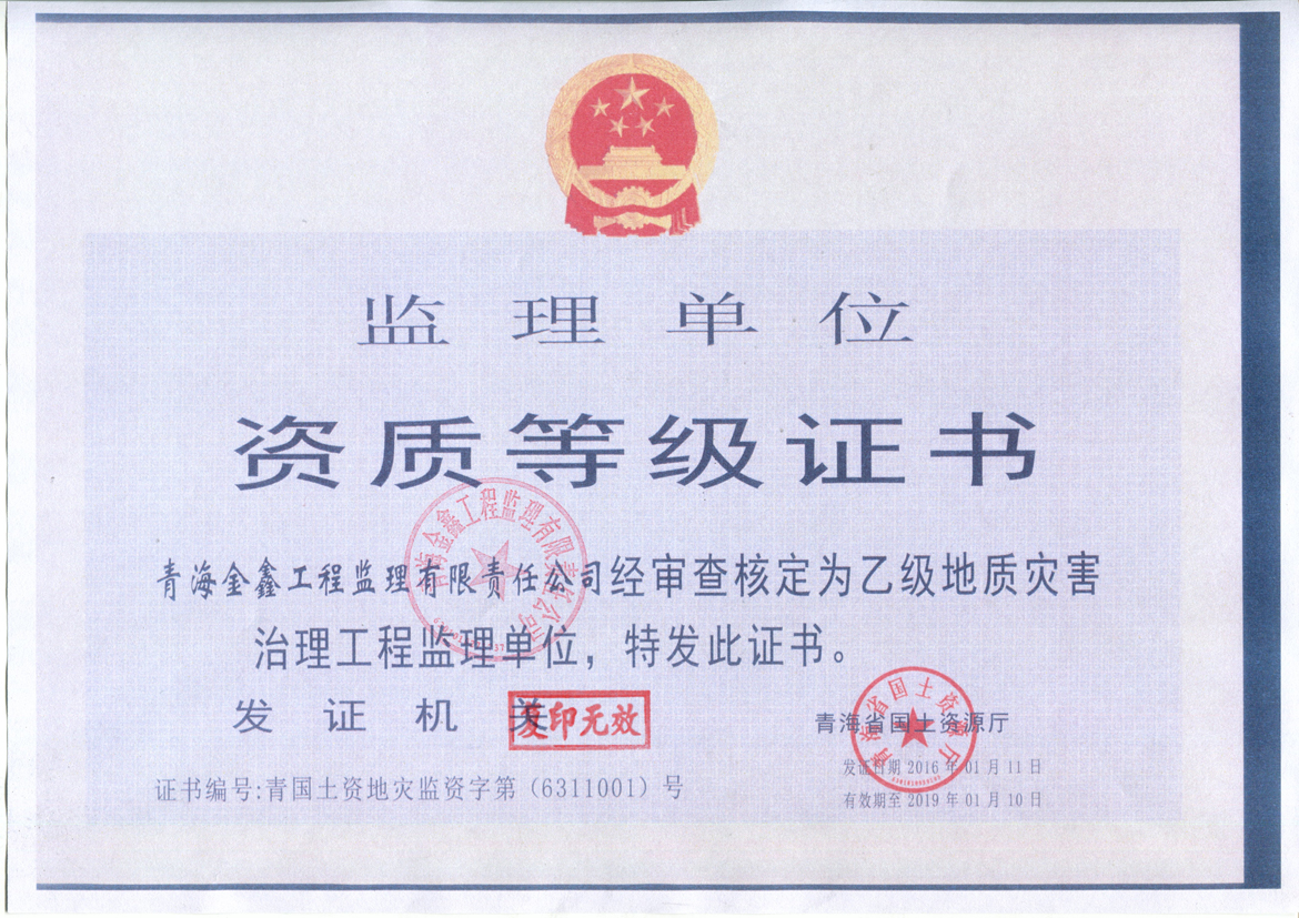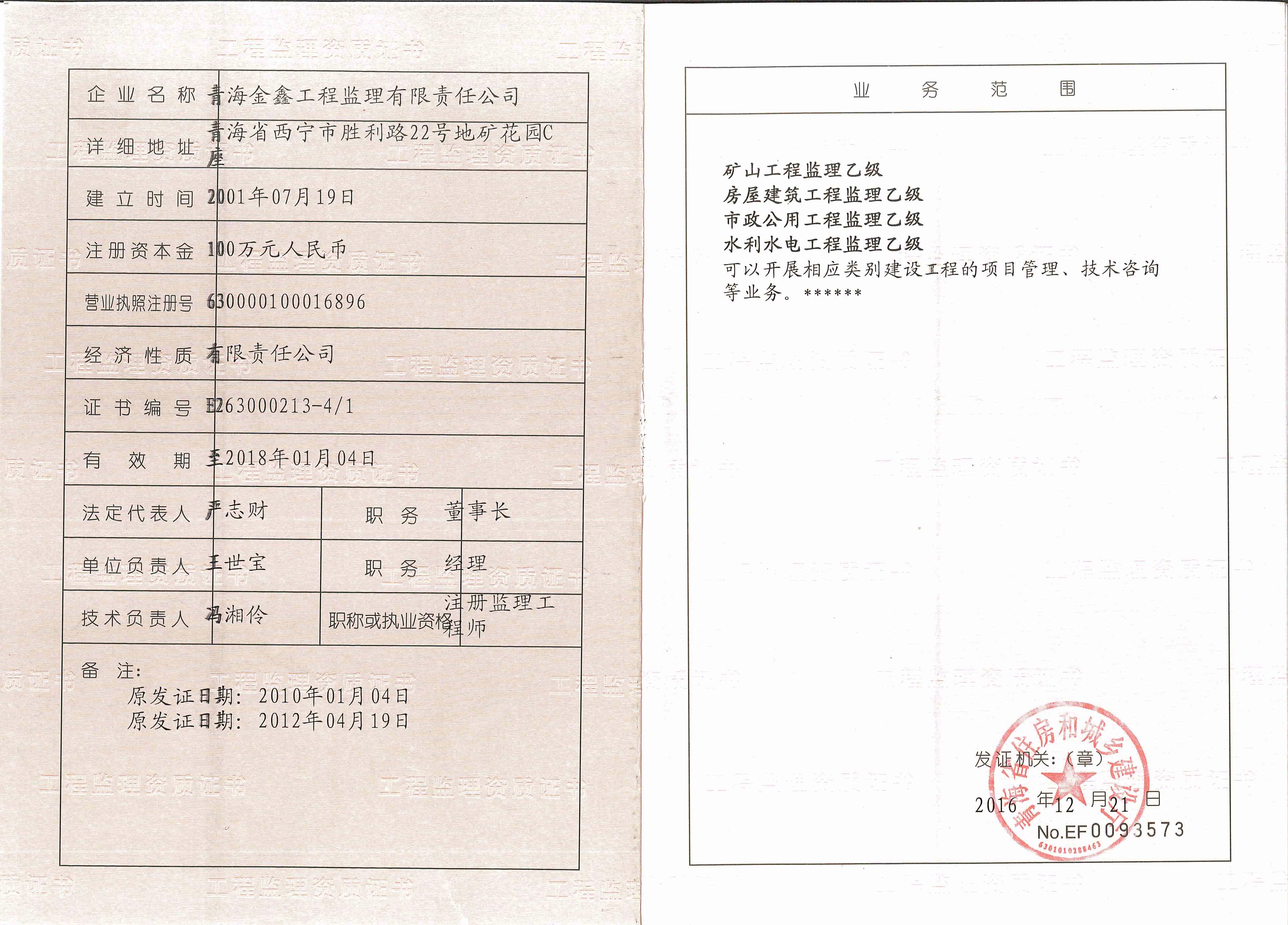 青海金鑫工程監(jiān)理有限責(zé)任公司成立于2001年7月,注冊(cè)資本壹佰萬元整。是青海省建設(shè)廳主管的專業(yè)化監(jiān)理單位,公司具有獨(dú)立法人資格,公司擁有礦山工程乙級(jí)(含地質(zhì)礦產(chǎn)勘查);房屋建筑工程乙級(jí);給水排水建筑工程乙級(jí);垃圾處理工程乙級(jí);生態(tài)工程乙級(jí);水利水電工程丙級(jí);城市道路工程乙級(jí);風(fēng)景園林工程乙級(jí)資質(zhì)。其中地質(zhì)勘查監(jiān)理是我國首家取得資質(zhì)的監(jiān)理單位,也是青海省唯一的地質(zhì)勘查監(jiān)理單位。